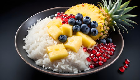 bowl of rice, pineapple, pomegranate and blueberries,on black background