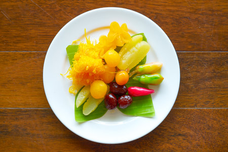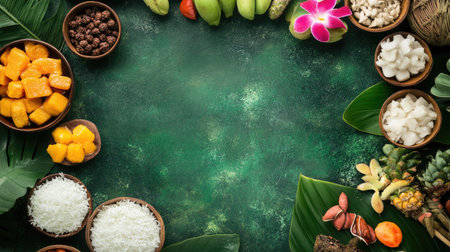 A traditional Thai dessert spread with fruit and coconut-based sweets, leaving a large area around for adding text.