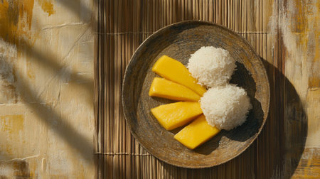 A platter of mango sticky rice, with sweet mango slices, glutinous rice, and a drizzle of coconut cream.