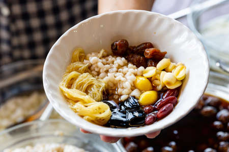Traditional taiwanese iced dessert. Include Taro balls, Sweet potato balls, Barley with Shaved Ice and Boba Topping Served with Fresh milk in Earthenware bowl. No focus, specifically.