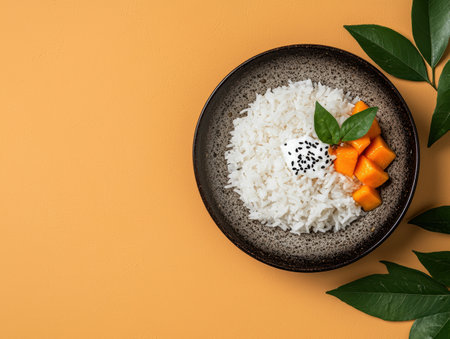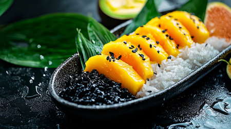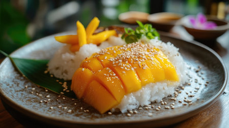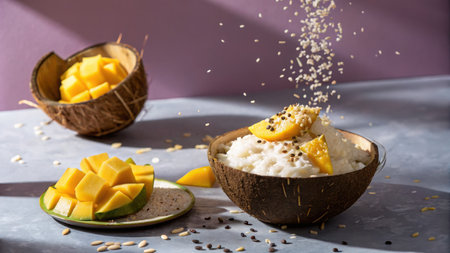 A stunning display of coconut rice topped with fresh mango and sesame seeds, set against a stylish background. Perfect for food photography.
