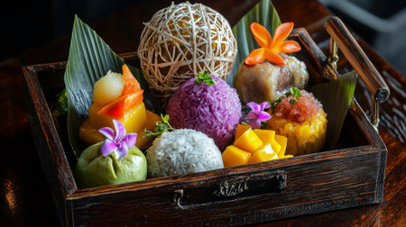 A stunning assortment of Asian desserts featuring sticky rice and tropical fruits, beautifully arranged in a wooden tray for a vibrant and colorful presentation.