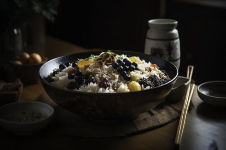 A bowl of steaming, fluffy rice figurine made from white sorghum and red dates in an elegant black ceramic pot with wooden chopsticks placed on top. The background is filled with various ingredients like millet and spices, creating a vibrant atmosphere. Captured using a Canon EOS R5 camera with a macro lens at an f/2.8 aperture setting to highlight the intricate details, using focus stacking. --chaos 50 --ar 16:9 --stylize 750 --v 6.1 Job ID: 5c27030c-fdd1-492a-8027-3509a904ffc6