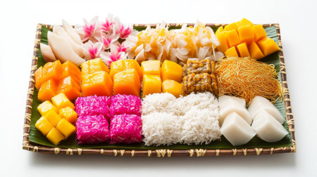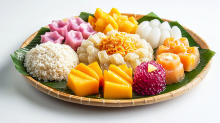 A beautiful arrangement of traditional Thai sweets like mango sticky rice and coconut dumplings on a white plate, set against a clean white background, showcasing vibrant colors and textures.