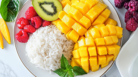 A visually appealing plate featuring ripe mango, kiwi slices, fresh raspberries, and fluffy rice. Perfect for a tropical dessert or healthy snack.