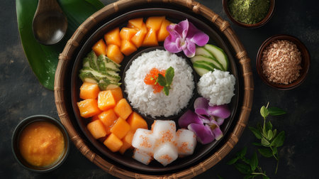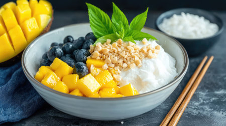 A beautifully arranged bowl of traditional Thai sticky rice paired with fresh mango and coconut, garnished with herbs and blossoms, highlighting vibrant colors and natural textures.
