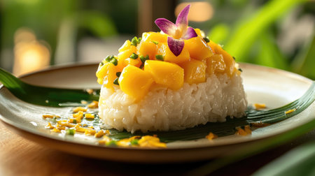 An elegant dining scene with beautifully plated mango sticky rice, drizzled with coconut sauce, set against a backdrop of tropical leaves, highlighting its allure.