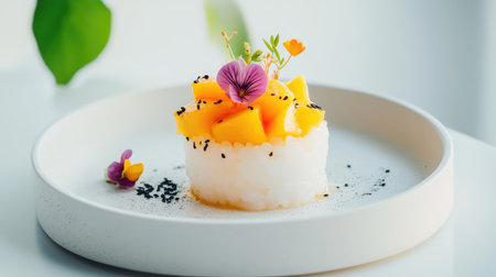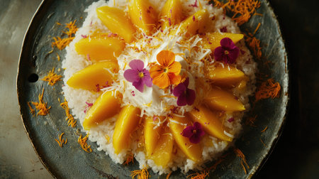 A beautiful dessert featuring sticky rice topped with ripe mango and adorned with edible flowers, presented on a minimalist plate, perfect for any occasion.