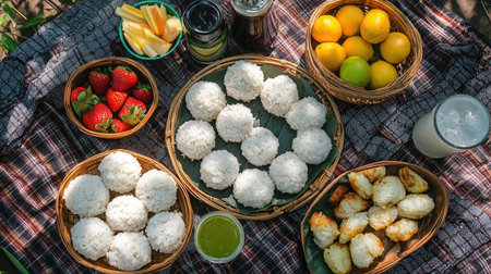 An inviting picnic spread featuring steamed rice, fresh fruits like strawberries and lemons, and a variety of vibrant dishes set on a patterned tablecloth.
