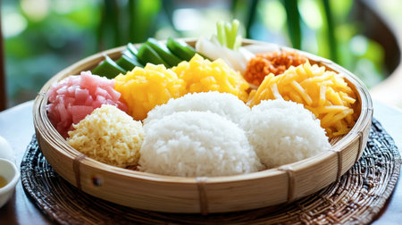 A vibrant display of colorful rice varieties served in a bamboo tray, showcasing fresh ingredients and garnishes, ideal for culinary presentations.
