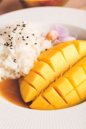 Delicious mango sticky rice serve with coconut milk on wooden table. Popular traditional dessert of Thailand.