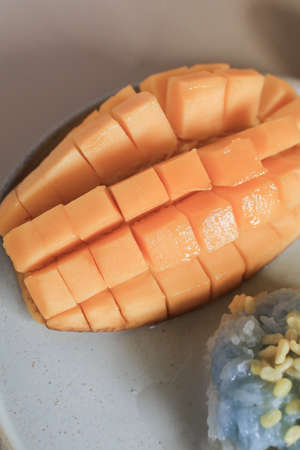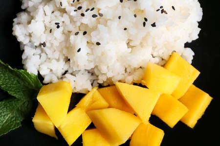 Delicious mango sticky rice with coconut milk and sesame seeds