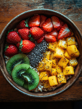 A wooden bowl filled with creamy oatmeal features a vibrant arrangement of strawberries, kiwi, mango, and chia seeds.