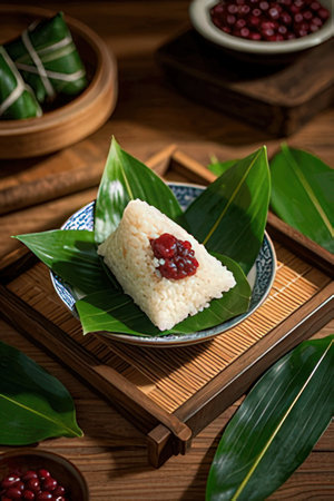 A close-up of a bowl of showcasing delicate rice dumplings and vibrant fruits, surrounded by traditional decorations for a cultural event.