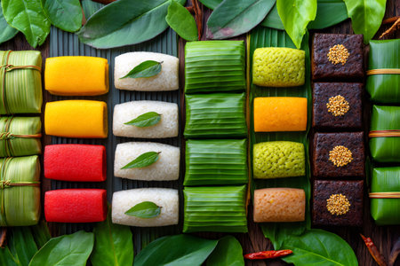 Assortment of colorful kuih, traditional Malaysian delicacies, arranged on banana leaves, showcasing rich culinary heritage