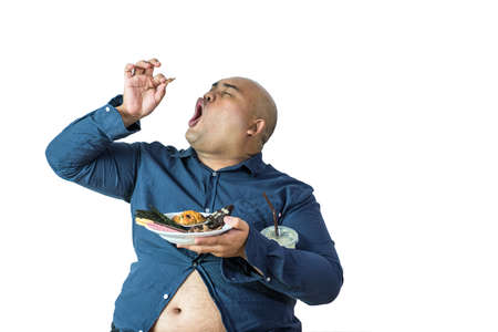 fat man eating, portrait of overweight person feels hungry and eating chips,cake,green tea frappe seated on armchai, isolated on white background
