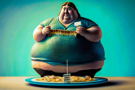 Fat man sitting on top of plate of food. Generative AI.