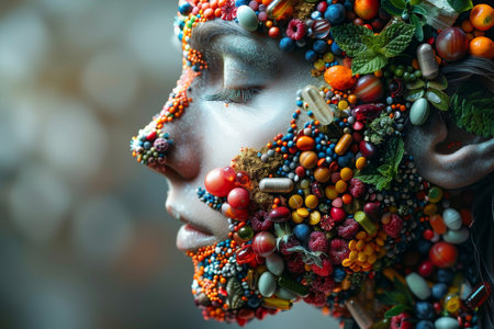 The woman's face is covered with various pills and capsules symbolizing medicines and health care.