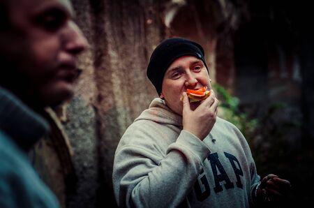 Kaliningrad, Russia - August 12, 2020: Plump mature male biting delicious takeaway sandwich and looking away on blurred background of crowd on city street