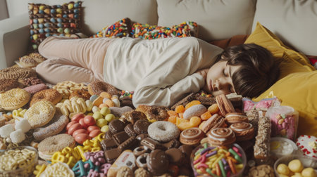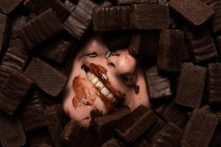 The face of a caucasian woman surrounded by sweets. The girl is smeared in sweets