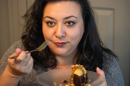 Overweight woman sits in chair and eats sweet cake