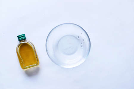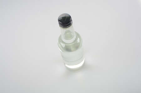 Ethanol alcohol in glass bottle on white background, covid 19, cleaning alcohol