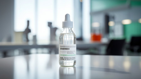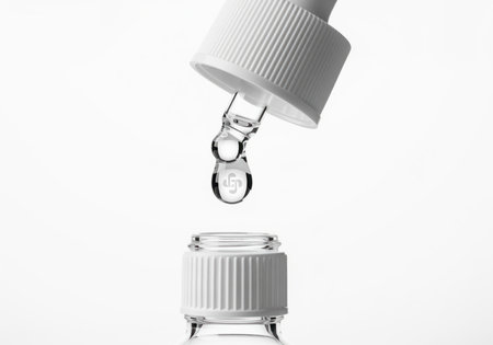 Clear liquid drop suspended from a glass pipette dropper, precisely falling into the neck of a transparent bottle. focus on medicine, dosage, and purity.