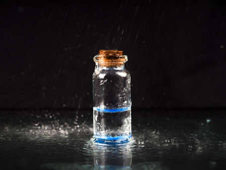 one bottle with a blue liquid and a cork on a black background, next to raindrops. Space for text. Medical research, refreshing cosmetics.