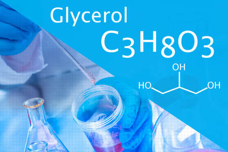 Glycerol. C3H8O3. cryobiology. Cryopreservation. Use of glycerine in medecine. C3H8O3 in pharmacology. Concept - use of glycerin in the Food Stamp purposes. Man mixes chemicals. Human and Test Tubes