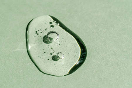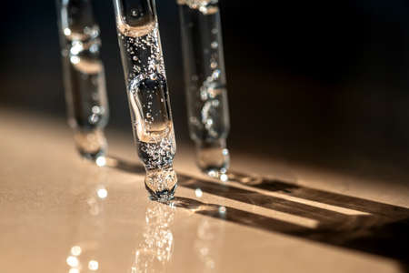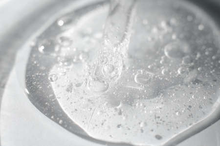 Cosmetic pipette with hyaluronic acid. Transparent gel with bubbles close-up. Gel cream or serum. A sample of a cosmetic product. Antibacterial gel.