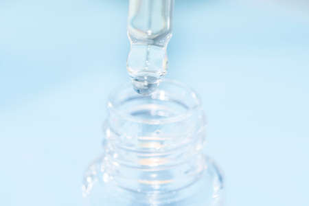 detail of face serum pouring out of pipette over a bottle on a blue background focus on the dropper