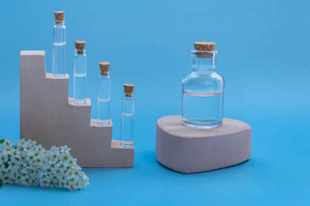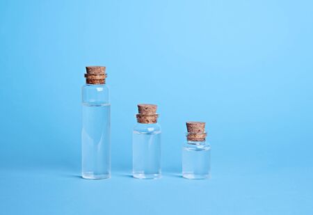 Liquid or oil in small bottles with cork plugs on light blue background.