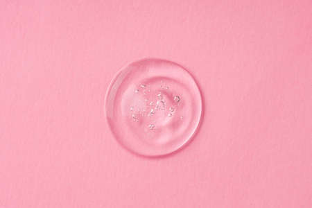 Transparent drop of cosmetic product serum gel. Liquid texture with bubbles on pink background in top view. Skincare products, natural cosmetic. Beauty concept for face and body care