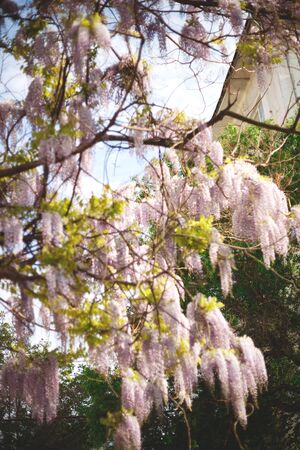 Closeup photo of purple blooming wisteria flower hanging from above in the yard of a private house