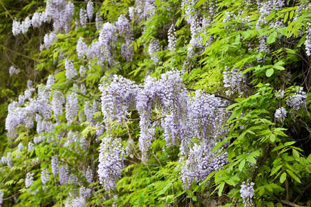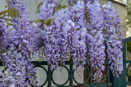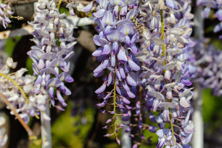 Blooming Wisteria Sinensis with scented classic purple flowersin full bloom in hanging racemes closeup. Garden with wisteria in spring