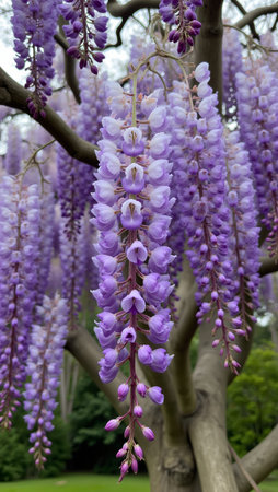 Enchanting wisteria tree with cascading purple flowers on twisted branches