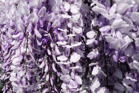 Blooming wisteria close-up. Delicate purple bunches of flowers on a defocused background