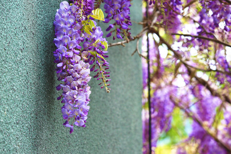 Purple wisteria flowers hanging from a tree with the gray wall for background, Bean Tree, Chinese Wisteria, Purple Vine