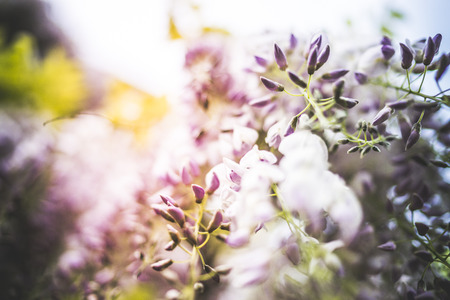 Wisteria flowers are blooming in sunset garden. High quality photo