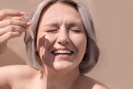 Woman with short light hair is applying skincare serum to her face, smiling in soft natural light, highlighting her healthy skin and joyful beauty routine