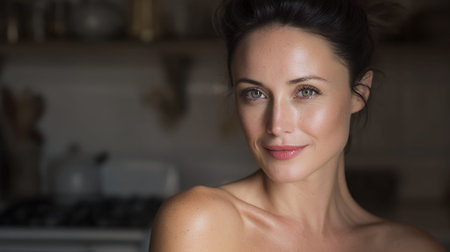 A woman with dark hair pulled back and green eyes smiles gently at the camera. She is bare-shouldered, and the background suggests she is in a kitchen.