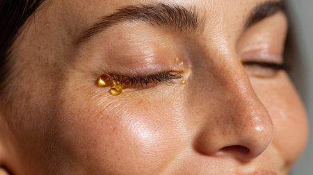 A serene close-up of a woman's face with oil drops resting gently on her skin. The image showcases a healthy and hydrated beauty routine, emphasizing self-care and natural skincare products.