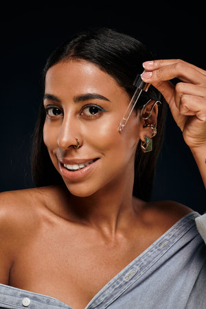 A confident African American woman showcases her skincare products in a professional studio.