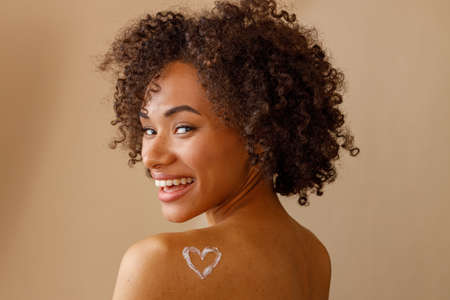Portrait of beautiful young African woman moisturizing face cream and smiling
