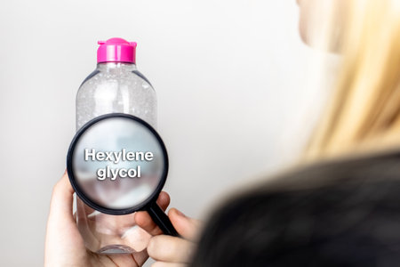 A woman examines the harmful ingredients of the micellar waterthrough a magnifying glass. Means with hexylene glycol. The concept of hazardous substances in cosmetics and household chemicals