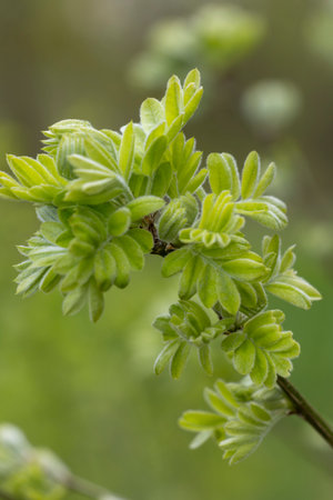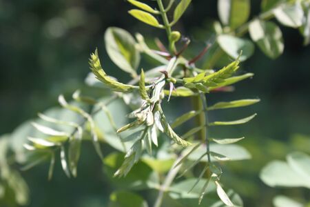 Beautiful fresh green acacia bush leaves in the spring. Natural springtime scenery in Latvia, Europe.