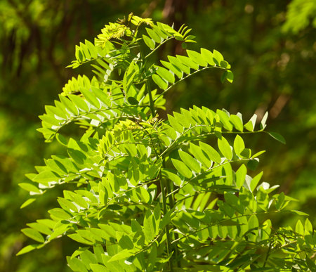 Lush green compound leaves on a black locust tree branch creating a vibrant natural pattern and symbolizing growth, freshness, and environmental beauty in outdoor light