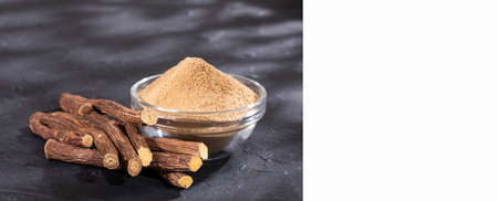 Ayurvedic Mulethi or Liquorice root stick or jeshthamadh powder served in a bowl over moody background