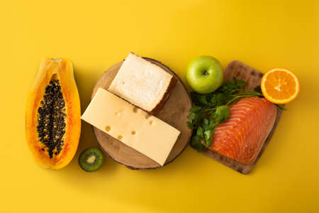 Vitamin A in food with fruit, vegetables, cheese, fish and meat on yellow background