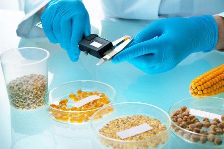 Researcher analyzing agricultural grains and legumes in the laboratory. GMO research of cereals. Testing of genetically modified seeds
